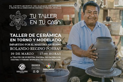 La funcionaria municipal informó que esta actividad virtual forma parte del programa “Tu taller en tu casa” y será trasmitida el día sábado 20 de marzo, a las 17:00 horas; a cargo del taller estará el maestro alfarero, Rolando Regino Porras, originario de la comunidad de Santa María Atzompa, hijo de padres artesanos destacados y reconocidos. A lo largo de su proceso como alfarero, Rolando ha mantenido el compromiso con la innovación y creación de nuevos caminos, lo que le ha permitido nutrirse de la tradición y, al mismo tiempo, utilizar las nuevas tecnologías para crear un particular estilo que lo identifica.