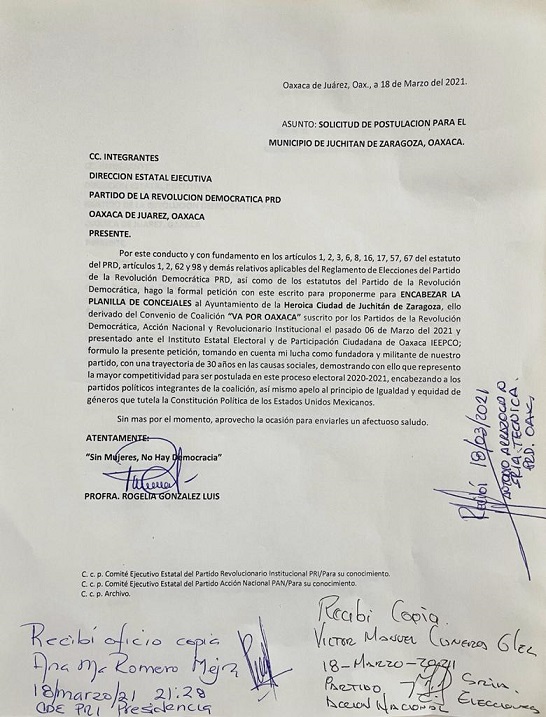 Juchitán de Zaragoza, Oaxaca, Sábado 20 de Marzo, 2021 (Fuente: Comunicado).- La activista de causas sociales, Rogelia González Luis, presentó una solicitud de postulación como candidata a la Presidencia Municipal de Juchitán de Zaragoza, para encabezar la coalición “Va por Oaxaca” que integran los partidos de la Revolución Democrática, Acción Nacional y Revolucionario Institucional.