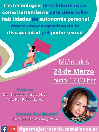 En esta charla que se llevará a cabo el miércoles 24 del presente a partir de las cinco de la tarde por la página de Facebook @gesmujer.rosario.castellanos.ac, la Innovadora Social Carmen Ana Montiel Fundadora del movimiento Wheeling Women, nos hablará sobre como la inmersión de las personas con discapacidad en los entornos digitales es un ejercicio interesante, cada vez más está tomando fuerza a través de movimientos de interacción, rompiendo el patrón, visualizando la discapacidad en una esfera de empoderamiento y desafío, permitiendo inspirar al público en un concepto de “Plataforma” gestando el desarrollo de una vida sin límites, redescubriendo el universo del cuerpo humano, agregando valor desde la aceptación, el amor propio y el respeto, este conjunto de acciones positivas, motivan a las personas a construir espacios físicos y virtuales con prácticas de accesibilidad e inclusión en el constructo social.