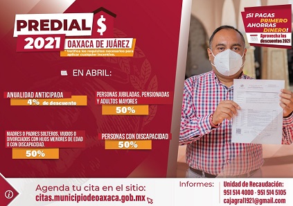 Oaxaca, Oaxaca, Jueves 01 de Abril, 2021 (Fuente: Comunicado).- El ayuntamiento de Oaxaca de Juárez, a través de la Tesorería Municipal, informa que en el mes de abril continúan los beneficios que otorga el Programa de Incentivos Fiscales 2021 para el pago de impuestos.