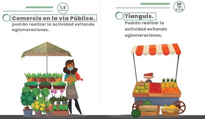 Asimismo, los tianguis podrán realizar la actividad evitando aglomeraciones. Se observarán obligatoriamente las medidas como: uso correcto de cubrebocas y/o caretas, contar en cada puesto con alcohol gel al 70 por ciento o agua y jabón, y se podrá operar hasta las 18:00 horas.