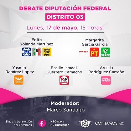 Yazmín Ramírez López, del Partido Movimiento Ciudadano (MC); Basilio Ismael Guerrero Camacho, del Partido Redes Sociales Progresistas (RSP); y Arcelia Rodríguez Carreño de Fuerza por México, cuyo evento será trasmitido a través de las páginas de Facebook: INEOaxaca e INE Huajuapan; en punto de las 15 horas, cuyo moderador será el comunicador Marco Santiago.