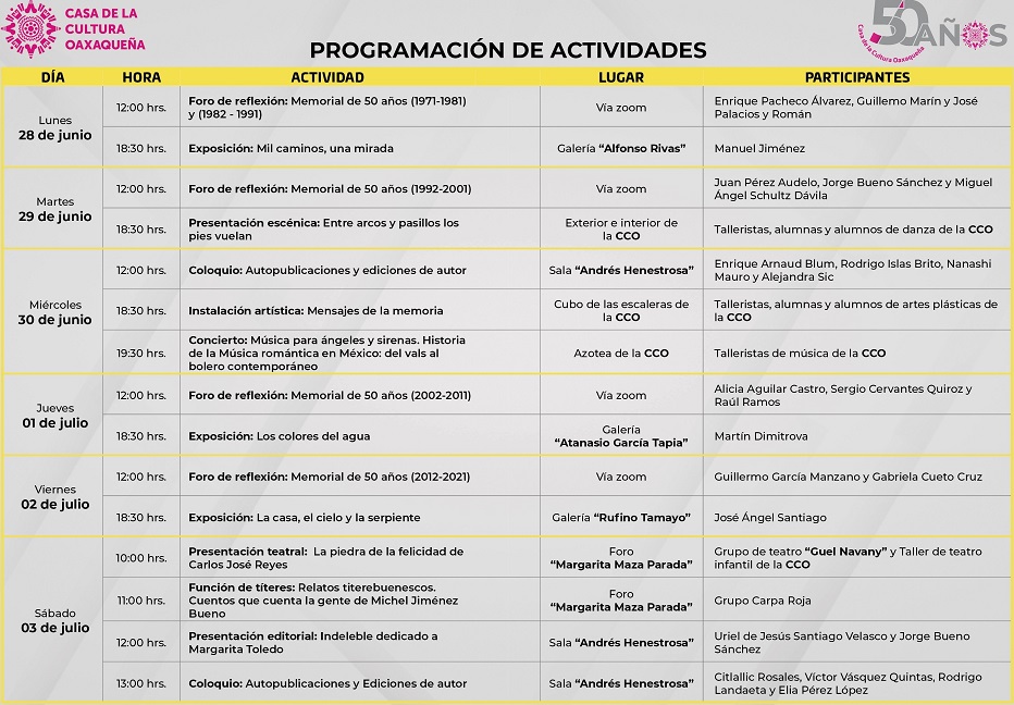 Asimismo, la ciudadanía podrá disfrutar del foro de reflexión Memorial de 50 años, el cual contará con la participación de las y los ex directores de la Casa de la Cultura Oaxaqueña, quienes aportarán sus vivencias y anécdotas ocurridas durante su gestión.