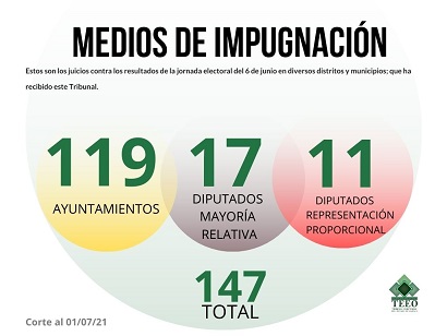 Con corte al 1 de julio, ante el Tribunal Electoral del Estado de Oaxaca (TEEO) se presentaron 147 medios de impugnación, de los cuales, 119 corresponden a la elección de concejales, 17 de diputados de mayoría relativa y 11 de representación proporcional.