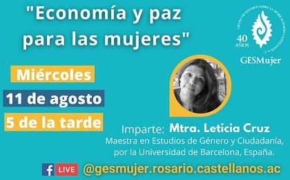 Oaxaca, Oaxaca, Martes 10 de Agosto, 2021 (Fuente: Comunicado).- Continuando con el ciclo de video charlas, que el Grupo de Estudios sobre la mujer Rosario Castellanos, está realizando durante este mes, acerca del empoderamiento económico de las mujeres; el próximo miércoles 12 de agosto, se llevará a cabo la charla virtual “Economía y paz para las mujeres”, a cargo de la Maestra en Estudios de Género y Ciudadanía, por la Universidad de Barcelona, España, Leticia Cruz.