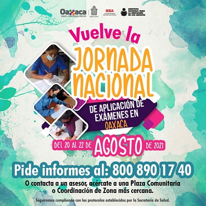 Oaxaca, Oaxaca, Sábado 14 de Agosto, 2021 (Fuente: Comunicado).- El Instituto Estatal de Educación para Adultos (IEEA) de Oaxaca invita a las personas adultas y jóvenes mayores de 15 años a terminar su primaria o secundaria en la próxima Jornada Nacional de Aplicación de Exámenes a realizarse en diversas coordinaciones de zona ubicadas en varios municipios del estado, del viernes 20 al domingo 22 de agosto.