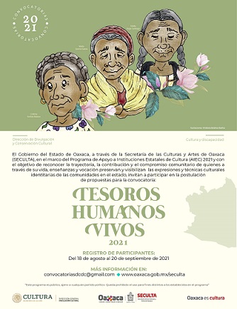 Oaxaca, Oaxaca, Jueves 19 de Agosto, 2021 (Fuente: Comunicado).- En reconocimiento a la trayectoria, contribución y compromiso comunitario de quienes a través de su vida, enseñanzas y vocación preservan y visibilizan las expresiones y técnicas culturales identitarias de las comunidades, el Gobierno del Estado a través de la Secretaría de las Culturas y las Artes de Oaxaca (SECULTA) como parte del Programa de Apoyo a Instituciones Estatales de Cultura (AIEC), presenta la convocatoria Tesoros Humanos Vivos en su edición 2021.