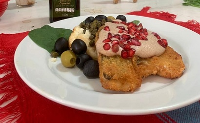 3. Se presenta en una cama de espinacas con un poco de vinagreta. Encima va el pescado bañado en la nogada y se adorna con granada, alcaparras, aceitunas negras y rama de perejil.