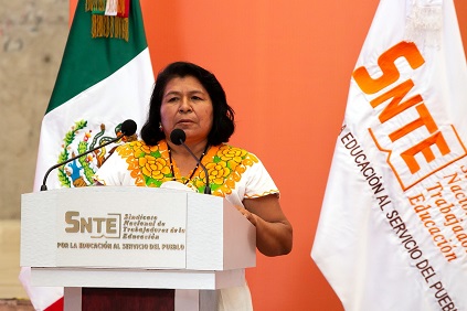 Durante la ceremonia realizada en el marco del Día Mundial de los Docentes, la maestra que labora en la Escuela Primaria Bilingüe “Lic. Eduardo Vasconcelos” de la Sección 59 del SNTE, en San Simón Zahuatlán, Huajuapan de León, Oaxaca, municipio catalogado por el Coneval como uno de los 10 municipios más pobres del país, emitió un emotivo discurso en su lengua materna, el mixteco.