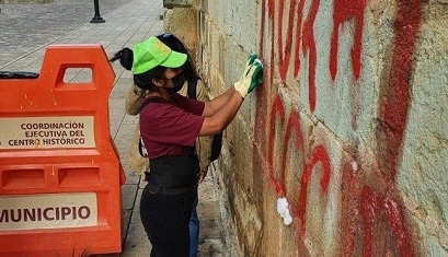 “Estamos dando respuesta inmediata para remover unos grafitis que dañaron las paredes laterales del Templo de Santo Domingo, por ello, trabajamos de manera coordinada con una especialista del INAH para retirar el daño hecho a este inmueble, ya que este espacio forma parte del Patrimonio de la Cultural de la Humanidad. Este trabajo se tendrá que realizar en diferentes etapas, ya que tiene que ser una labor minuciosa siguiendo los lineamientos establecidos por el INAH para realizar esta tarea de manera adecuada”, subrayó la servidora pública.