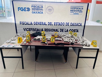 Oaxaca, Oaxaca, Jueves 21 de Octubre, 2021 (Fuente: Comunicado).- La Fiscalía General del Estado de Oaxaca (FGEO) coordinó y ejecutó un cateo en la región de la Costa en un domicilio particular ubicado en jurisdicción de la Villa de Tututepec de Melchor Ocampo, donde se aseguraron drogas y armas.