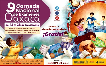 Oaxaca, Oaxaca, Miércoles 10 de Noviembre, 2021 (Fuente: Comunicado).- El Instituto Estatal de Educación para Adultos (IEEA) de Oaxaca, invita a las y los jóvenes mayores de 15 años y a personas adultas, a terminar su educación primaria o secundaria en la próxima Jornada Nacional de Aplicación de Exámenes a realizarse en las 26 Coordinaciones de Zona ubicadas en las ocho regiones del estado, del viernes 12 al domingo 28 de noviembre.