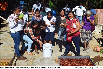 Pluma Hidalgo, Pochutla, Oaxaca, Viernes 19 de Noviembre, 2021 (Fuente: Agencias).- Motivados por un afán de aprender a elaborar Cafés Especiales, en esta comunidad cafetalera, un nutrido grupo de pequeños productores café y técnicos capacitadores, el pasado 11, 12 y 13 de noviembre asistieron al “Seminario Caficultura Sostenible, Cambio Climático y Cafés de Especialidad” impartido por el productor e investigador Enrique López Aguilar, y organizado por la Secretaría de Economía del Gobierno del Estado de Oaxaca que encabeza el Lic. Juan Pablo Guzmán Cobián.