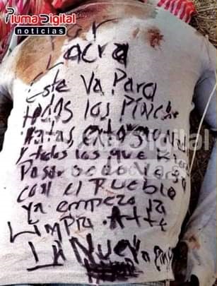 “Soy lacra, esto le va a pasar a todos las ratas que se quieran pasarse de verga con el pueblo. Atte: LA NUEVA EMPRESA”.