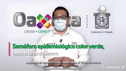 Durante el resumen semanal de la situación epidemiológica actual de la emergencia sanitaria, el jefe del departamento de Enfermedades No Transmisibles de la institución, Gerardo Zacarías Jiménez, confirmó que con base al «Lineamiento para la estimación de riesgos del semáforo por regiones COVID-19», emitido por el Gobierno Federal, Oaxaca continuará en semáforo color verde hasta el 12 de diciembre.