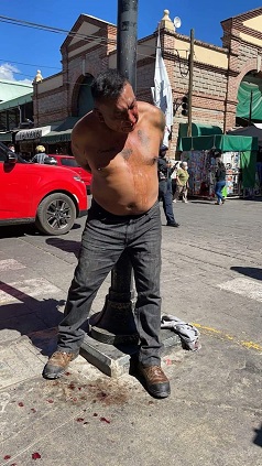 Oaxaca, Oaxaca, Lunes 06 de Diciembre, 2021 (Fuente: Agencias).- En Oaxaca, un grupo de comerciantes ambulantes amarró este lunes a un hombre de un poste en la zona del Centro Histórico de la capital del estado, por intentar robar un celular y una cadena de oro a una mujer.