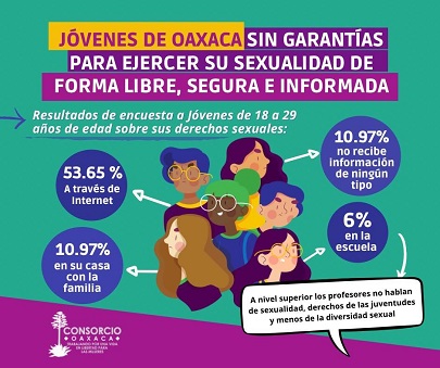 Oaxaca, Oaxaca, Miércoles 15 de Diciembre, 2021 (Fuente: Comunicado).- En Oaxaca el incumplimiento de las responsabilidades y obligaciones del Estado hacia las y los jóvenes no garantiza sus derechos sexuales y reproductivos. Frente a una realidad marcada por enormes rezagos en el acceso a la salud, la educación y la opacidad en el manejo de la información pública, las personas de edades tempranas se viven en alto riesgo de no ser atendidas ante enfermedades de transmisión sexual, embarazos no deseados, y prevalece la coerción, violencias y discriminación.
