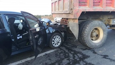 El choque se presentó entre vehículo particular y camión tipo volteo.