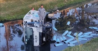 Se advierte que, el conductor de la unidad tuvo una mala maniobra y, por el exceso de carga, volcó, quedando caído sobre un costado, arrojando su carga (los cilindros de gas) sobre el cauce.