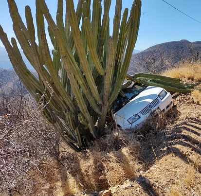 Oaxaca, Oaxaca, Lunes 27 de Diciembre, 2021 (Fuente: Agencias).- En Oaxaca, un automovilista que jugaba carreristas en la carretera panamericana, federal 190, Oaxaca-Tehuantepec, derrapó y se salió de la carretera y un cactus que encontró en el camino lo salvó de caer a un voladero.