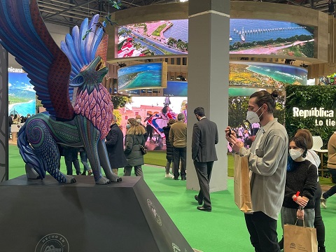 Oaxaca, Oaxaca, Sábado 22 de Enero, 2022 (Fuente: Comunicado).- El esplendor de una figura alada tallada en madera de copal, engalana el pabellón de México y Oaxaca en la Feria Internacional de Turismo (FITUR) 2022, de Madrid, España.
