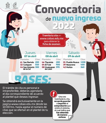 Las y los aspirantes a los planteles de mayor demanda podrán obtener su cita en línea del 7 al 9 de abril y la entrega de fichas para el resto de planteles se realizará del 2 al 6 de mayo, ambos procesos se llevarán a cabo en la página www.cobao.edu.mx