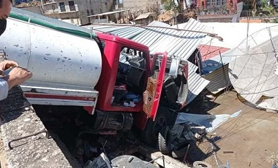 Oaxaca, Oaxaca, Sábado 12 de Marzo, 2022 (Fuente: Agencias).- En Oaxaca, dos pipas de agua potable de empresas privadas se quedaron sin frenos y una de ellas se impactó contra una vivienda, dejando sólo daños materiales, no se reportan víctimas ni heridos, según informó la Policía Vial estatal.