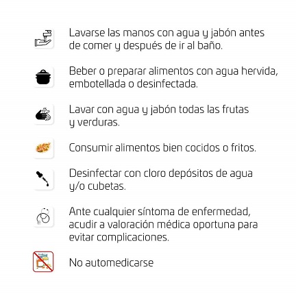 Asimismo, lavarse las manos con agua y jabón antes de comer y después de ir al baño, beber o preparar alimentos con agua hervida, embotellada o desinfectada, lavar y desinfectar verduras y frutas, consumir alimentos bien cocidos o fritos, desinfectar con cloro depósitos de agua y/o cubetas