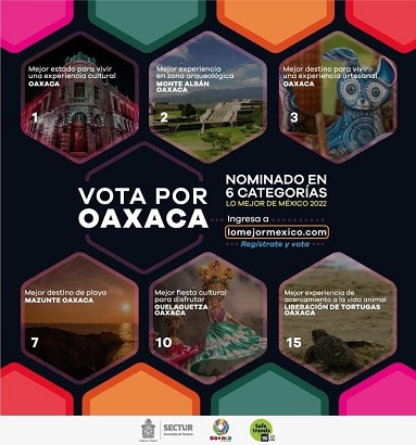 El Pueblo Mágico de Mazunte como «Mejor destino de playa»; la Guelaguetza está nominada como «Mejor fiesta cultural para disfrutar»; y con la liberación de tortugas en las costas de Oaxaca, la categoría «Mejor experiencia de acercamiento animal».