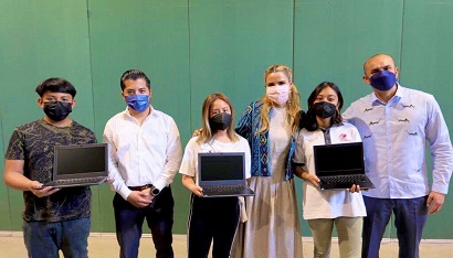 Oaxaca, Oaxaca, Martes 12 de Julio, 2022 (Fuente: Comunicado).- La presidenta honoraria del Sistema DIF Oaxaca, Ivette Morán de Murat, en compañía del director general del Colegio de Bachilleres del Estado de Oaxaca (COBAO), Rodrigo González Illescas; y del titular del Instituto de la Juventud del Estado de Oaxaca (INJEO), Jairo Sánchez Cruz, entregaron computadoras portátiles a jóvenes estudiantes de excelencia de este Colegio y del Instituto.