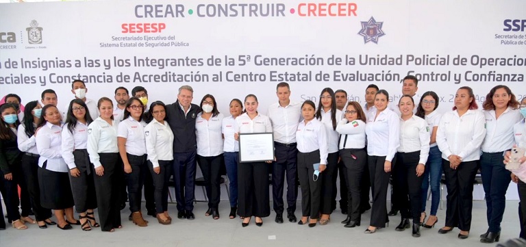 San Pablo, Etla, Oaxaca, Lunes 22 de Agosto, 2022 (Fuente: Comunicado).- Con el objetivo de reconocer la labor, el compromiso y la lealtad de las y los integrantes de la Unidad Policial de Operaciones Especiales (UPOE) de la Policía Estatal de Oaxaca, el gobernador Alejandro Murat Hinojosa, hizo entrega de 25 insignias a las y los integrantes de la 5ª generación de este destacamento.