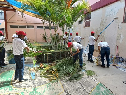 Los conscriptos, en conjunto con el área de Protección Civil y Emergencia Escolar del Instituto, personal educativo, madres y padres de familia, realizan en las instalaciones escolares tareas como la limpieza en general, incluidos techumbres y tinacos, pintura exterior e interior, instalación de señalética y poda de árboles, entre otros.