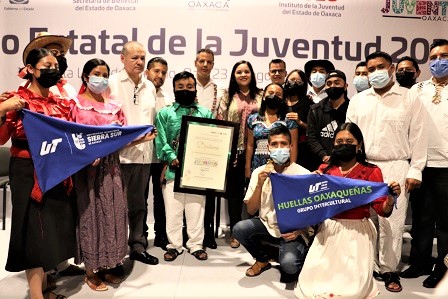 Oaxaca, Oaxaca, Miércoles 24 de Agosto, 2022 (Fuente: Comunicado).- El gobierno del estado reconoci+o con el “Premio Estatal de la Juventud 2022”, a jóvenes estudiantes de la Universidad Tecnológica de la Sierra Sur de Oaxaca (UTSSO), informó la rectora de esta casa de estudios, Jazmín Jeanneth Sumano Celaya.