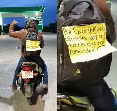 Él es muy entregado a su trabajo, no pone pretextos para asistir hasta allá, se arriesga durante carretera para ir a la comunidad y enseñar a sus alumnos, por lo que carga un letrero pegado a su mochila con la leyenda “Por favor, no me atropelles, voy a dar clases a mi comunidad”.