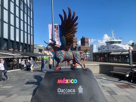 Oslo, Noruega, Lunes 05 de Septiembre, 2022 (Fuente: Comunicado).- Oaxaca continúa “enamorando” al continente europeo, pues ahora se encuentra presente con el alebrije monumental “Toro-Águila” en Aker Brygge, el corredor comercial y turístico más concurrido de Oslo, capital de Noruega.