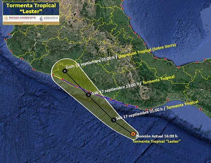 Lester se encuentra 175 kilómetros al sur de Puerto Escondido, Oaxaca y a 400 kilómetros al sureste de Acapulco, Guerrero y se desplaza a vientos máximos sostenidos de 65 kilómetros por hora. Se estima que mañana tocará tierra en las costas cercanas a Acapulco, Guerrero, y se desplazará hacia costas de Lázaro Cárdenas, en Michoacán.