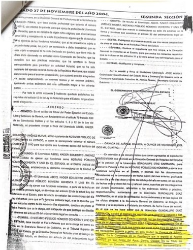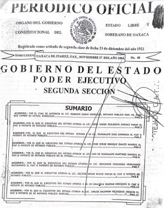 “…se les hace saber que la Licenciada Guadalupe Díaz Carranza, aprobó el examen por oposición para obtener la patente o Fiat de notario de número en el Estado; y además con las documentales todas a favor de la Licenciada Guadalupe Díaz Carranza, consistentes: En el acta de su Nacimiento en la que consta que nació el día 12 de octubre de mil novecientos sesenta y ocho, en esta ciudad de Oaxaca de Juárez, Oaxaca; En la constancia de su Residencia que le expidió el Agente Municipal de San Felipe del Agua, Centro Oaxaca; en su Título de licenciado en derecho, expedido por la Universidad Iberoamericana…”