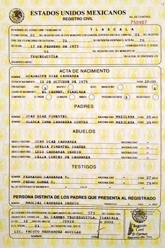 En los documentos del registro público aparecen los siguientes datos, Guadalupe Díaz Carranza, nació en el estado de Tlaxcala, de acuerdo al acta que se encuentra asentada en el Registro Civil de Tlaxcala, en el libro 01, en la foja 72, acta 72, de fecha 17 de febrero de 1977, en el folio 0472057, su nombre real es Blanca Guadalupe Díaz Carranza y nació el 12 de octubre de 1976.