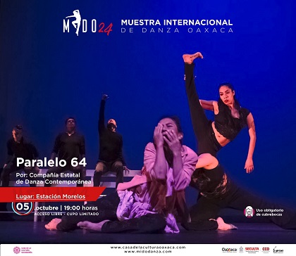 Por la tarde, a las 19:00 horas, la Compañía Estatal de Danza Contemporánea presenta Paralelo 64 una pieza colectiva que surge de la reflexión sobre los diferentes lenguajes del cuerpo y lo que el ser humano, en constante movimiento interno, sortea minuto a minuto.