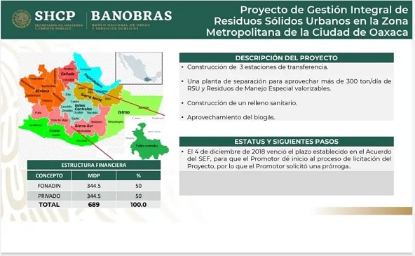 Y es que fue el propio Gobierno del estado de Oaxaca que impulsó el Proyecto de “Gestión Integral de Residuos de la Zona Metropolitana de Oaxaca de Juárez” bajo la modalidad de Asociación Público Privada, lo que permitiría brindar la solución a la actual problemática en materia de residuos.