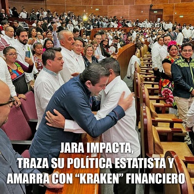 “No tiene la culpa el indio, sino el que lo hace compadre”, afirma la expresión popular que evoca discriminación, racismo y xenofobia, pero todavía muy utilizada en el ámbito político. Cargado de pudor, en su momento de saludar personalmente a los asistentes a su toma de protesta como gobernador en el recinto legislativo del Congreso de Oaxaca, hubo una escena singular en la que todos voltearon a observar, casi nadie se perdió el saludo que le rindió Salomón Jara al veracruzano Fernando Padilla Farfán, un “Kraken” financiero.