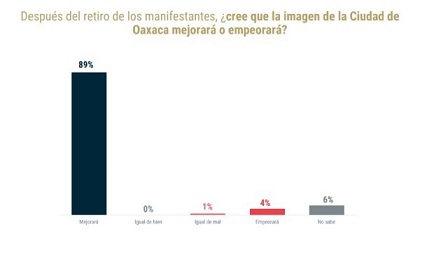 De igual forma, en la encuesta se hace público que el 50% de la ciudadanía se consideró beneficiada tras el retiro de las personas manifestantes originarias de la región triqui. Mientras que, con esta acción, el 89% de personas entrevistadas aseguró que la imagen de la ciudad de Oaxaca va a mejorar.