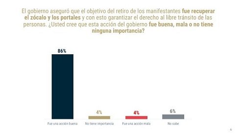 Cabe señalar que esta acción efectuada (con estricto apego a derecho y que la ciudadanía, en su mayoría, ve como un acierto) fue reconocida por el presidente de México, Andrés Manuel López Obrador, acción que calificó como necesaria, tras más de una década de negativa de los manifestantes de liberar dicho espacio público.