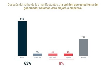 A tan sólo unos días del inicio de la administración del gobernador Salomón Jara y con el retiro de quienes se manifestaban, la encuesta señala que, en suma, el 63% por ciento de la población cree que la opinión hacia el mandatario oaxaqueño mejoró o continúa igual de bien.