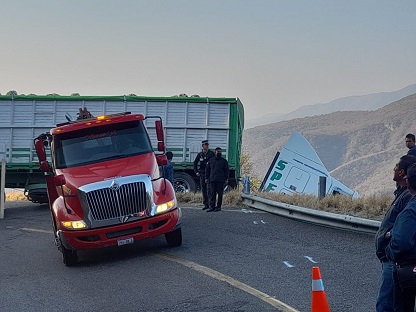 Oaxaca, Oaxaca, Viernes 10 de Febrero, 2023 (Fuente: Agencias).- Corporaciones de auxilio se trasladaron a la carretera federal 190, Oaxaca-Istmo, debido al reporte de un tráiler que sufrió un percance y a punto estuvo de caer al voladero; la pesada unidad quedó con la cabina colgada y la caja atravesada sobre la carretera.