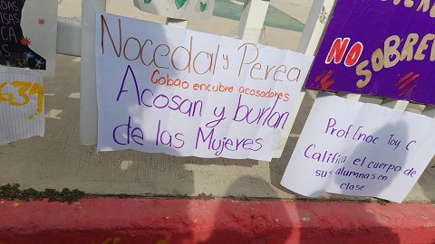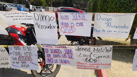 Las estudiantes ventilaron a los catedráticos, presuntos acosadores, en cartulinas que colgaron afuera del plantel, mientras que otras se pararon a la orilla de la carretera federal 190, para darlo a conocer a los automovilistas y peatones.