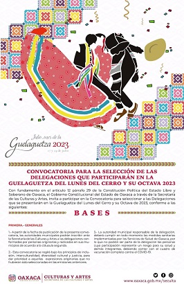Oaxaca, Oaxaca, Sábado 11 de Marzo, 2023 (Fuente: Comunicado).- El gobierno del estado de Oaxaca, a través de la Secretaría de las Culturas y Artes de Oaxaca (SECULTA), invita a participar en la convocatoria para la selección de las Delegaciones que se presentarán en la Guelaguetza del Lunes del Cerro y Octava 2023 a realizarse este 17 y 24 de julio.