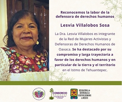 Enfatizaron que la Dra. Lesvia Villalobos quien es también integrante de la Red de Mujeres Activistas y Defensoras de Derechos Humanos de Oaxaca cuenta con más de tres décadas de trayectoria como defensora de derechos humanos.