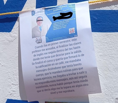 Oaxaca, Oaxaca, Miércoles 15 de Marzo, 2023 (Fuente: Agencias).- Alumnas del Instituto Tecnológico de Oaxaca (ITO) se unieron el pasado lunes a la serie de manifestaciones para demandar a presuntos acosadores y agresores sexuales en instituciones educativas, por lo que en las instalaciones pusieron pancartas y un tendedero con los nombres de maestros y compañeros que presuntamente tienen conductas inapropiadas con las mujeres.