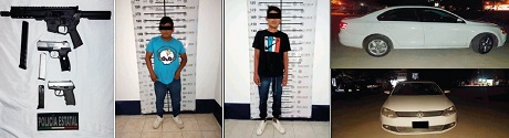 Derivado también de los recorridos de seguridad, la Policía Estatal logró la detención de dos masculinos, a quienes se les aseguraron un arma de fuego tipo fusil, dos armas de fuego tipo pistola y un automóvil marca Volkswagen, tipo Jetta Beetle, en el municipio de San Pedro Pochutla de la región de la Costa.